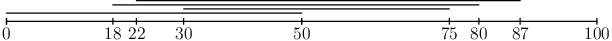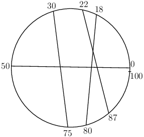 Predstavme si, že sme zobrali nožnice a prestrihli kruh medzi ľubovoľnými dvomi z bodov zadaných na vstupe – napríklad medzi bodmi s číslom $$0$$ a $$r$$. (Na našom obrázku teda medzi bodmi 0 a 100.) Kruh teraz chytíme za oba konce a vystrieme ho na úsečku. Pre kruh z príkladu vyššie by sme takto dostali nasledovnú úsečku: