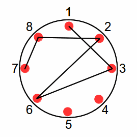 Jankove narodeniny sa pomaly, ale isto blížia, a aby nebol taký smutný, že už bude starý, Peťka mu chce upiecť jahodovú tortu. Jediné, čo sa jej dosiaľ nepodarilo vymyslieť, je, ako tortu ozdobiť. Určite na ňu chce zvrchu poukladať $$n$$ jahôd v pravidelných rozostupoch a pomedzi ne niečo nakresliť cukrovou polevou. Zatiaľ sa s ňou ale nenaučila robiť nič iné ako lomenú čiaru. Peťka preto chce tortu pokresliť lomenou čiarou, ktorá pôjde od jahody k jahode, medzi dvoma jahodami vždy len rovno. Nechce však, aby sa čiara kdekoľvek prekrížila sama so sebou, lebo by sa na tom mieste vytvoril cukrový hrboľ, čo je veľmi neestetické. Pomôžete jej zistiť, či sa čiara, ktorú naplánovala, prekríži?