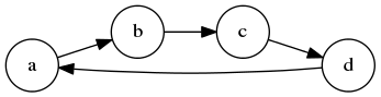 Pozrime sa, ako by vyzerala optimálna streľba. Keďže všetky vrcholy na kružnici sú rovnocenné a niekto musí začať strieľať, tak nech začne bandita $$c$$ výstrelom na $$d$$. Teraz ale bandita $$b$$, ktorý naňho mieril, nemá stlačením spúšte čo pokaziť a tak vystrelí. Teraz však môže bez problémov vystreliť bandita $$a$$. Ten už si môže vydýchnuť, lebo naňho mieriaci $$d$$ už bol zastrelený, $$a$$ teda prežije. Lepšie takýto graf už nevieme vyriešiť, lebo aspoň jeden bandita nám musí zostať nažive. Ľahko vidieť, že tento postup môžeme použiť aj na väčšie kružnice, ako aj najmenší možný prípad (dvaja na seba mieriaci banditi).