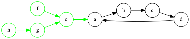 Nuž a čo ak komponent nie je len obyčajná kružnica? V takom prípade komponent vyzerá ako cyklus, do ktorého vedie niekoľko stromov (na obrázku je takýto strom vyznačený zelenou). V obyčajnom cykle nám musel zostať jeden bandita nažive, lebo strieľal ako posledný a už ho nemal kto ďalší zastreliť. Teraz však môžeme využiť to, že do kružnice mieri niekto iný.