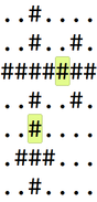 Na tomto obrázku sú farebne vyznačené tie #, ktoré patria do dvoch nepočmáraných plusiek (a teda náš algoritmus sa na ne pozrie dvakrát). Žiadnu mriežku však ako okraj platného pluska nebude skúšať viac ako dvakrát.