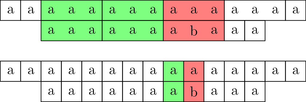 Predstavme si, že by sme vedeli rýchlo porovnávať nie len znak textu so znakom slova, ale aj súvislý blok textu dĺžky $a$ so súvislým blokom slova rovnakej dĺžky. Potom by sme vedeli pre každú začiatočnú pozíciu rýchlejšie zistiť, koľko porovnaní od nej spravíme: