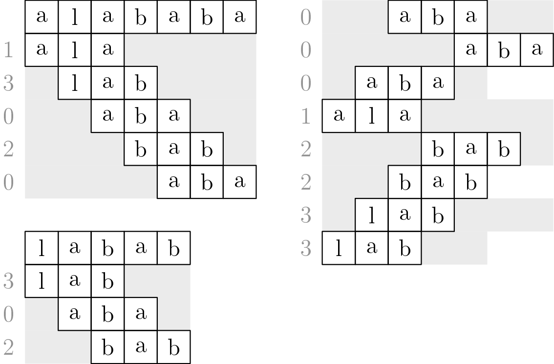 Nemusíme mať ale iba jednu veľkosť blokov. Bloky si môžeme rozdeliť do viacerých úrovní podľa ich dĺžky, a na každej úrovni ich očíslovať lexikograficky. Ďalej nám opäť stačí namiesto porovnávania obsahov blokov porovnávať ich čísla. Porovnávanie začneme na najvyššej úrovni. Vždy, keď nájdeme nezhodu, začneme porovnávať bloky o úroveň nižšie. Na najnižšej úrovni budú bloky dĺžky $1$, teda samotné znaky.