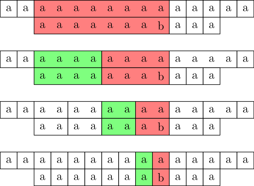 Pri porovnávaní budeme mať na každej úrovni najviac $1$ zhodu – $2$ zhody by totiž zodpovedali $1$ zhode na úrovni vyššie. Na aktuálnu úroveň sme sa ale mohli dostať iba tak, že na vyššej úrovni nastala nezhoda. Úrovní máme $O(\log {n})$, takže by sme mali iba $O(\log{n})$ blokových porovnaní pre každú začiatočnú pozíciu. Každé blokové porovnanie trvá $O(1)$ (porovnávame čísla veľké $O(n)$), táto časť algoritmu teda trvá $O(n \log {n})$.