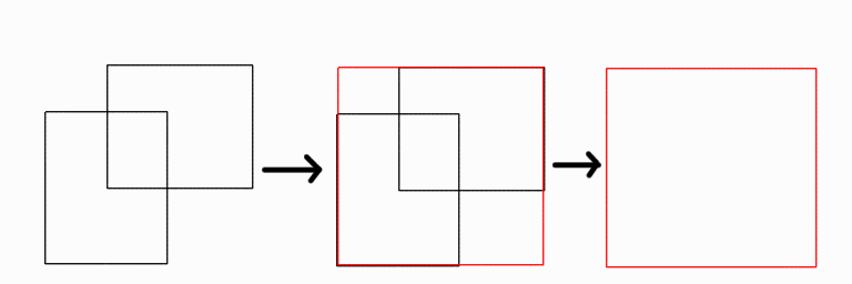 Funkcia berie ako argumenty dva obdĺžniky. Prvý je zadaný číslami $x_1, y_1, w_1, h_1$ a druhý číslami $x_2, y_2, w_2, h_2$. Výsledkom je obdĺžnik, ktorého ľavý okraj je tam, kde je ľavý okraj “ľavejšieho” z obdĺžnikov, pravý tam kde je okraj “pravejšieho” a podobne pre zvyšné prípady.
