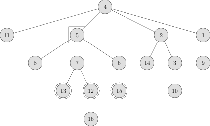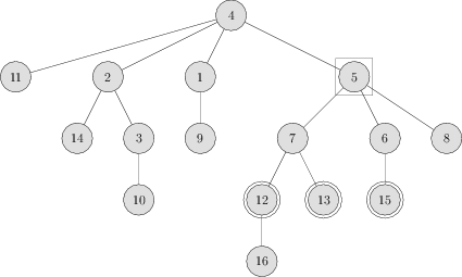 Po chvíli kreslenia stromov a pozorovania rôznych $k$-potomkov rôznych vrcholov $v$ odpozorujeme, že tí potomkovia akosi vždy tvoria vo vrstve súvislý úsek. V nasledujúcom obrázku sú napríklad zobrazení $2$-potomkovia vrcholu $5$: