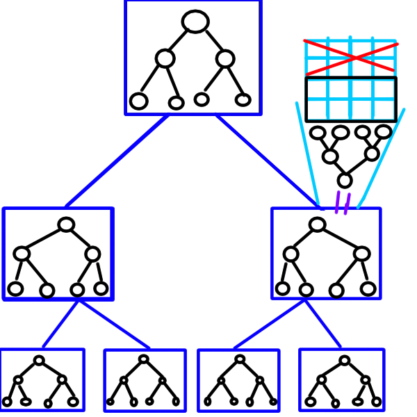 Najskôr si predpripravíme takýto 2D intervalový strom a updatneme $+1$ na políčka, kde ležia vrcholy.