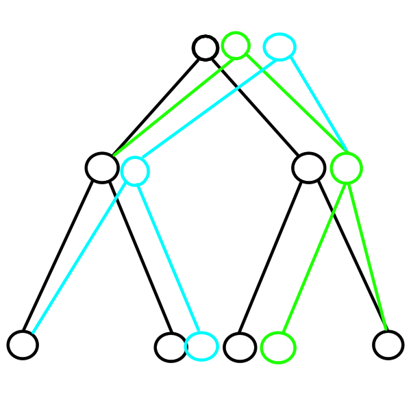 Pri updatnutí tretieho listu (pozície 3) vytvoríme nový list (zelenou). Následne updatujeme jeho rodiča (keďže sa vytvorilo nové, updatnuté dieťa). Na staré dieťa nazabúdame, starý rodičovský vrchol ostáva ako je, ale vytvárame nový zelený vrchol, ktorému ako deti dáme aktuálne verzie synov (teda ľavý zelený list a pravý čierny list). Následne ideme zas hore, a vytvoríme nový koreň, ktorého pointer do pravého syna ukazuje práve na náš nový zelený vrchol.