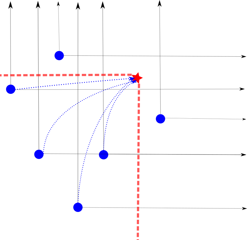 Ukáže sa, že nám stačí roztriediť si zavlažovače do skupín podľa smeru zavlažovania, a pre každý mať separátny intervaláč. Riešenie vieme použiť pre každý smer rovnaké, len si je treba situáciu vhodne rotovať. Toto nám pridá do časovej a pamäťovej zložitosti iba konštantný faktor.