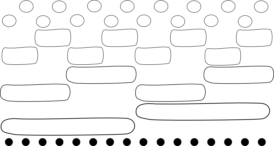 Na obrázku môžeme vidieť množiny pre $n = 16$. Ako prvé si všimnime, že takto dostaneme $2\lceil\log n\lceil$ otázok. Po druhé, tieto množiny nám vedia vyskladať všetky odpovede – predstavme si, že chceme odpoveď na $i$-tú posteľ (teda, ktoré farby sú na ostatných posteliach). Pozrime sa na binárny zápis čísla $i$. Ten nám presne povie ktoré query máme skombinovať. Ak má $i$3 na $j$-tom bite $1$, poto chceme použiť odpoveď pre párne $2^i$-tice a v opačnom prípade odpoveď pre nepárne $2^i$-tice. Keďže rôzne postele majú rôzne binárne zápisy a v každom “leveli” otázok sa každá posteľ nachádza v presne jednej z množín, vieme tak rozlišovať každú dvojicu postelí.
