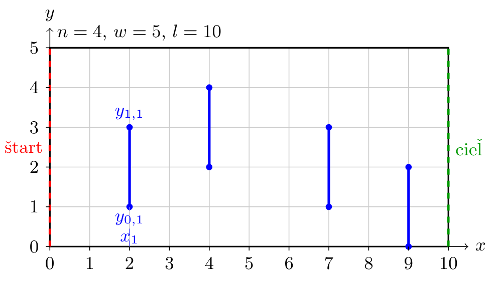 Máme parkovisko široké $w$ metrov a dlhé $l$ metrov. Na tomto parkovisku sa nachádza $n$ nabíjacích staníc. Nabíjacia stanica je zvislý pruh, $i$-ta nabíjacia stanica sa nachádza v stĺpci $x_i$, na rozpätí riadkov $y_{0,i}$ až $y_{1,i}$. Ak kolobežka prejde cez nabíjaciu stanicu (počíta sa aj jej okraj), tak sa okamžite nabije na plnú kapacitu.