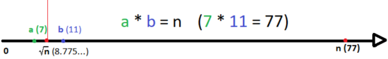 V najhoršiom prípade teda spravíme $O(\sqrt n)$ operácií, ak je číslo prvočíslo alebo súčinom dvoch čísel blízko jeho odmocnine. To je slušné vylepšenie (z obrázku môžete vidieť, o koľko menej čísel overíme už pre relatívne malé $n = 77$); ak by sme takto skúsili overiť všetky čísla od $1$ po $n$ v snahe nájsť všetky prvočísla, zabralo by nám to $O(n \sqrt n) = O(n^{3/2})$ času. V praxi toto môže s rýchlym programovacím jazykom stačiť pre $n$ rádovo $10^6$.
