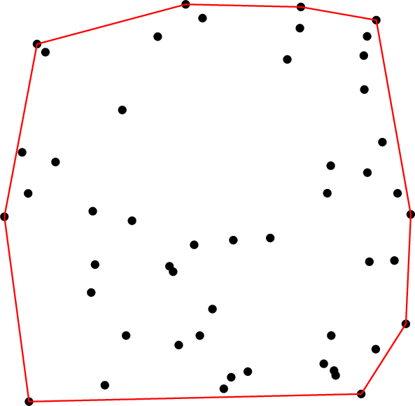 A nie je ťažké si uvedomiť, ako tento konvexný obal vyzerá: konvexným obalom danej konečnej množiny bodov v rovine je vždy mnohouholník, ktorého vrcholmi sú niektoré spomedzi zadaných bodov. (Spolu s danými bodmi musí konvexný obal obsahovať aj všetky úsečky spájajúce dva z daných bodov. Tie z úsečiek, ktoré ležia “na obvode”, tvoria hranicu hľadaného konvexného mnohouholníka.)