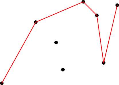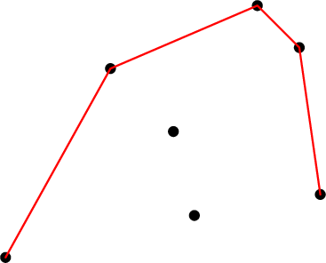 A nie je ťažké si uvedomiť, ako tento konvexný obal vyzerá: konvexným obalom danej konečnej množiny bodov v rovine je vždy mnohouholník, ktorého vrcholmi sú niektoré spomedzi zadaných bodov. (Spolu s danými bodmi musí konvexný obal obsahovať aj všetky úsečky spájajúce dva z daných bodov. Tie z úsečiek, ktoré ležia “na obvode”, tvoria hranicu hľadaného konvexného mnohouholníka.)